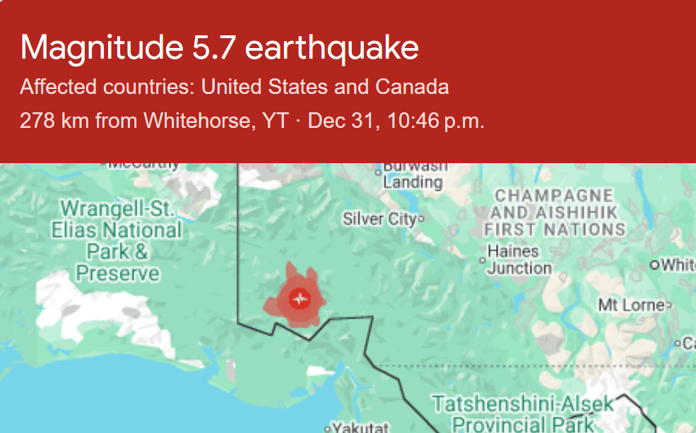 地震局指,第一次地震發生在太平洋時間晚上10點47分,震級為5.7級,震央位於阿拉斯加州,距離育空地區Haines Junction以西約140公里。